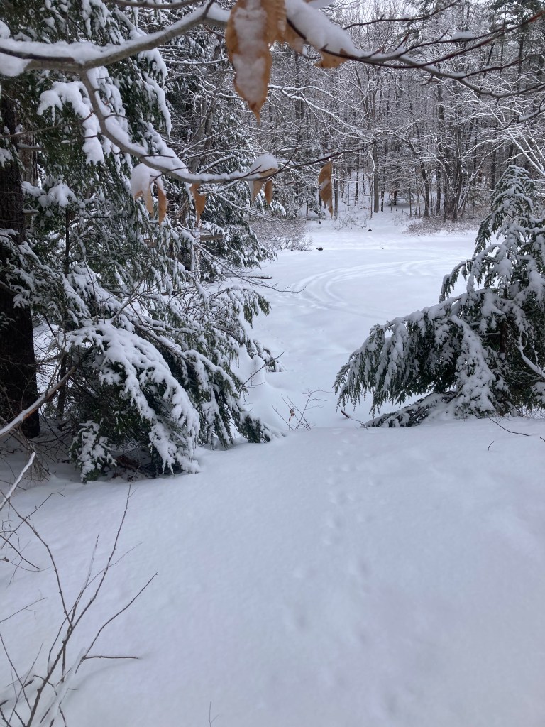 The area borders on Sebago cove, a narrow finger of water that connects to Sebago lake. The hike consists of three sections: a nearly level forest road the runs from the parking area north to…… and an offshoot trail that loops down to the water’s edge. One might just hike down to the water and then back up to rejoin the north south trail which one then fo9llows south back to the start.
