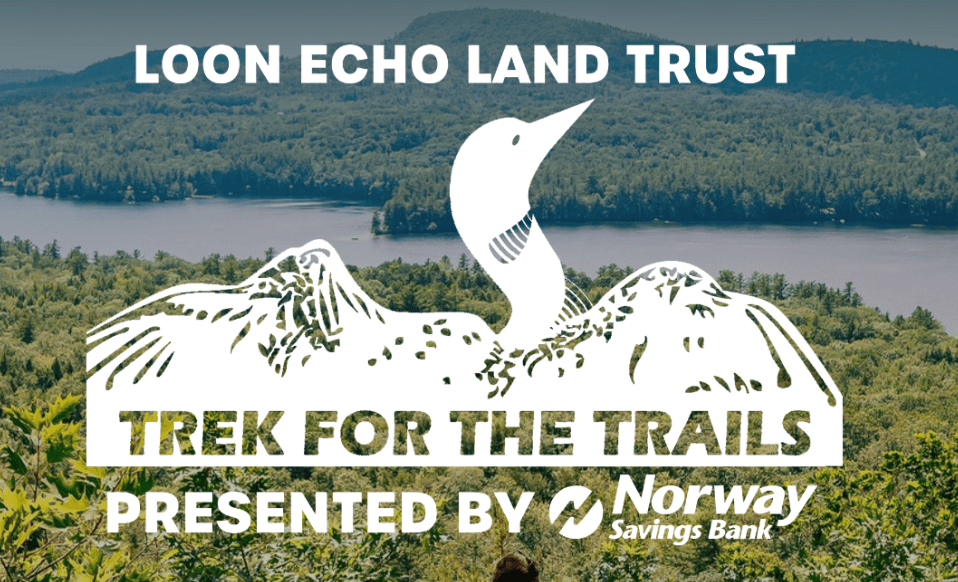 Trek for the Trails is Loon Echo Land Trust’s largest annual fundraising event. Funds raised from the Trek help Loon Echo steward over 9,300 acres of land and 35+ miles of trail in the Lake Region. The 2025 Trek for the Trails is presented by Norway Savings Bank.