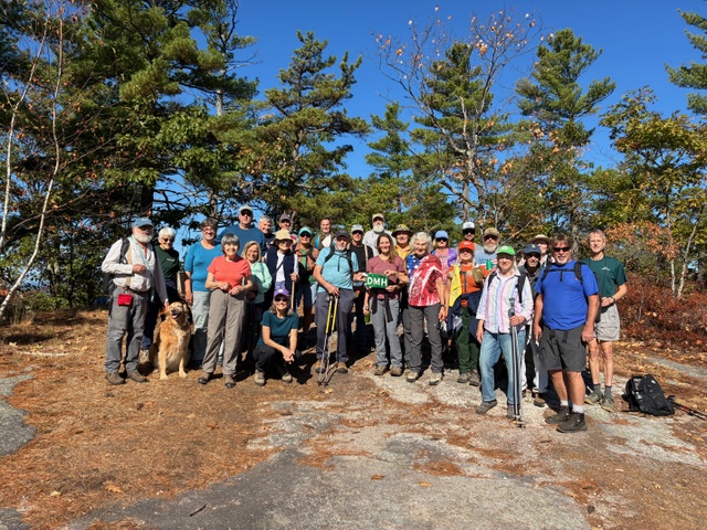 Twenty-eight Denmark Mountain Hikers gathered in the parking lot at the trailhead to Bald Pate Mountain under sunny skies and a temperature of 70° on a beautiful fall day. Hiking with us were Matt Markot, the Executive Director and Jon Evans, the Stewardship Manager of the Loon Echo Land Trust, the organization that oversees the Bald Pate Mountain Preserve. The plan was to climb Bald Pate and then to continue on down to Jacob Schor and Rena Bloom’s home on Peabody Pond for a cookout. Rena met us at the trailhead to ferry down our pot luck offerings for the cookout that was to follow the hike. Prior to hiking we had a moment of silence to remember our leader and mentor, Allen Crabtree, who died on July 30 and his wife Penny, who had died earlier this week. We left the trailhead at 9:15 am and headed up the Bob Chase Trail, a modest .7 mile 260’ climb to the summit. We enjoyed some nice views towards and beyond Peabody Pond and warm sunshine as we snacked and socialized at the summit.