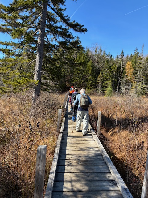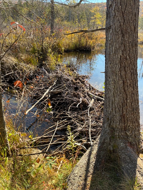 Visible were many small animal trails that crossed our trail and went down to the water. We also passed near a beaver dam and spotted other suspected dams and beaver lodges in the distance over the bog. Especially around the pond, the trees had shed most of their leaves enhancing our views of the surrounding mountains.