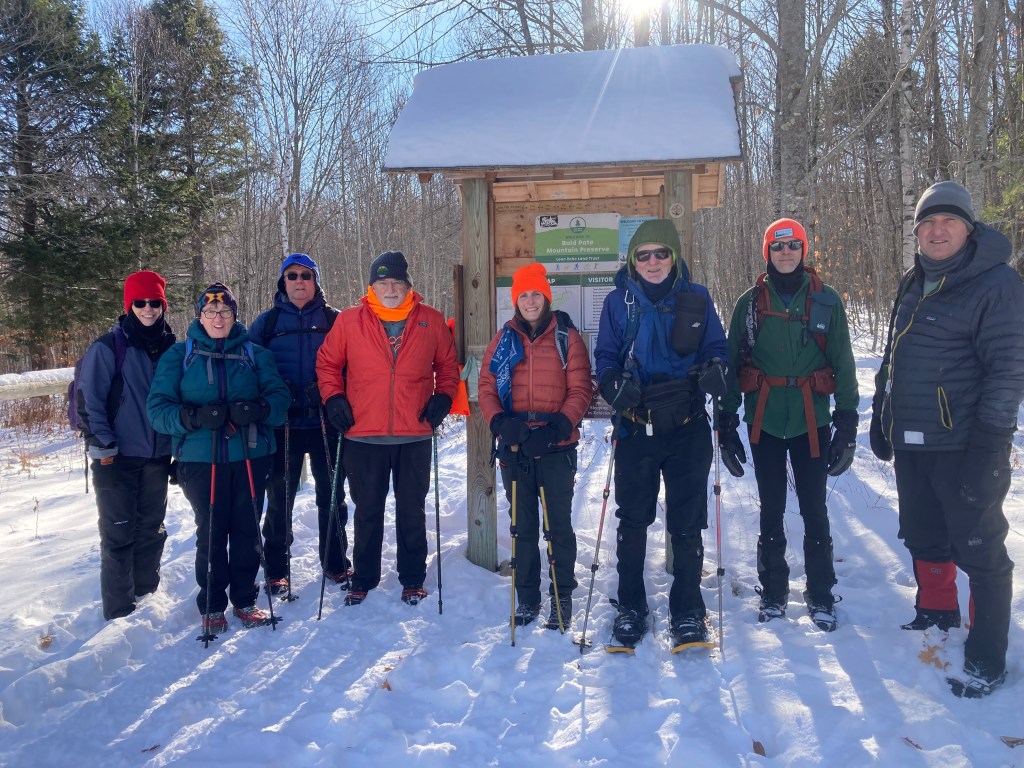 While we had all been looking forward to ascending Mt. Willard above Crawford Notch this Friday, it was decided to postpone that adventure the day prior based on the weather forecast that called for likely wind chills of -10 ° in the area. Bald Pate was a simewhat warmer but still chilly alternative: the temperature at the parking lot was about 5° degrees as a small band just nine of us gathered at 9:30 AM for our group picture.