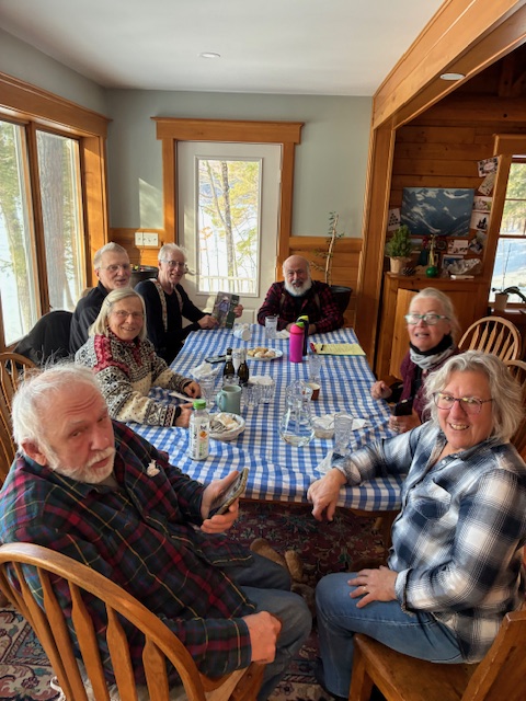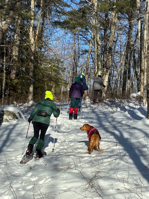 Due to the fact that the forecast over the past week predicted Friday’s temperature would be in the low single digits and that the planned destination of Peary Mountain’s summit would be even colder and windier, the decision was made to shift the hike to a more temperate adventure, the small hill behind Jacob and Rena’s home on Peabody Pond in Naples. This provided an opportunity to, again, take advantage of their hospitality and allowed us to celebrate the New Year’s indoors and hold our scheduling meeting around a warm and cozy table.