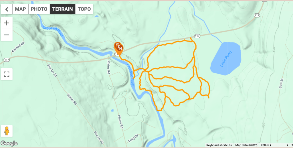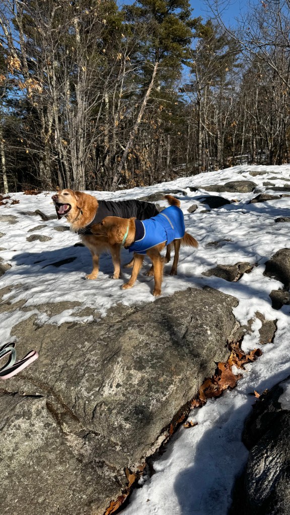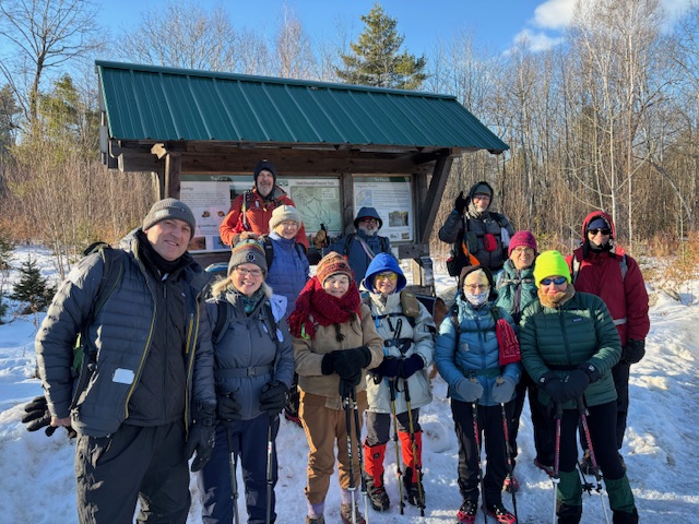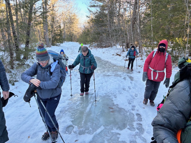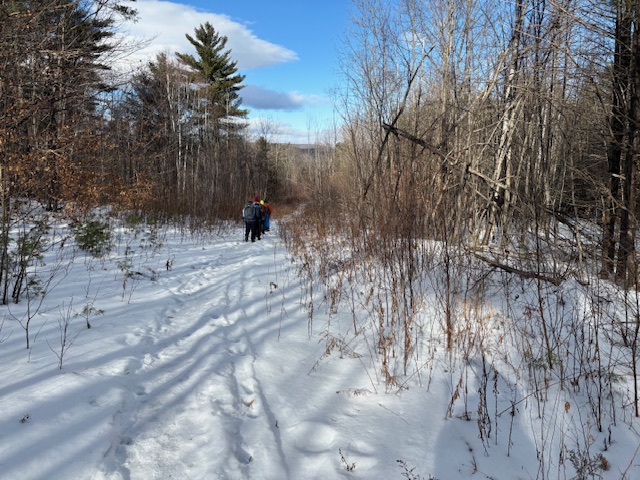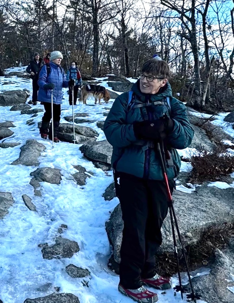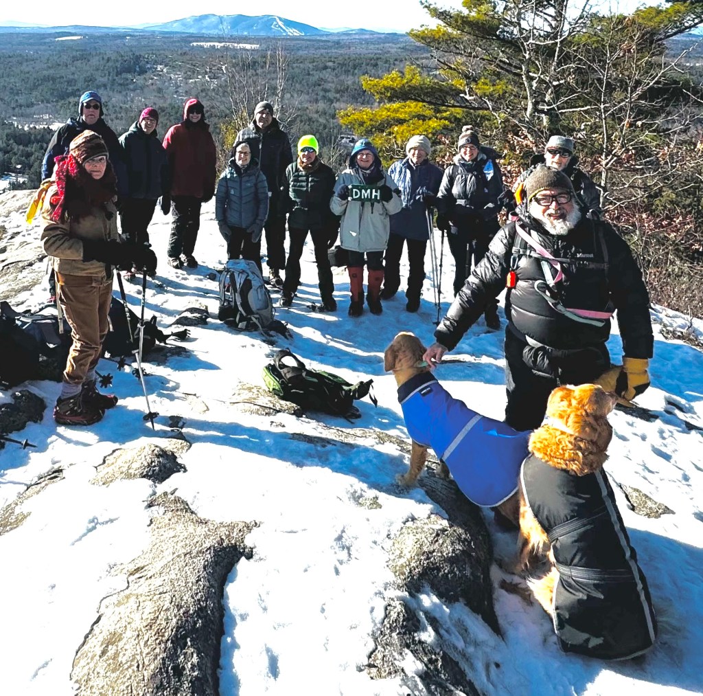 The weather turned sunny but cold for our planned hike up Hawk Mt. in Waterford, Me. on Friday, January 16, 2026. History states that an early survey crew who was working near the summit noted several hawks circling during their migration and coined the name. There has been a rough road/trail up Hawk for decades but in 2016, the 144 acre Hatch Preserve was donated to the Western Foothills Land Trust. With more land donated in 2017 and 2019, and together with town owned land, the total area preserved now stands at 219 acres. Several new trails have been recently added honoring and bearing the striking names of the Hamlin family members who settled this part of Waterford (Eleazar, Cyrus, America, Africa, Europe, and Hannibal Hamlin.).