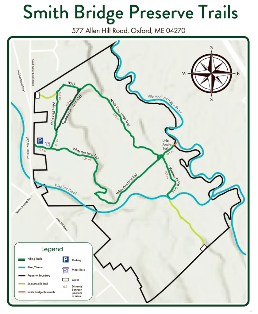 The walking is easy and flat, consisting entirely of one-lane tracks. The preserve is named after a covered bridge (one of three) that once spanned the Little Androscoggin River, the Smith Bridge, which was built in 1832 and demolished in 1935. The ruins are still visible. but don’t get too excited, there isn’t that much left of the bridge to see.