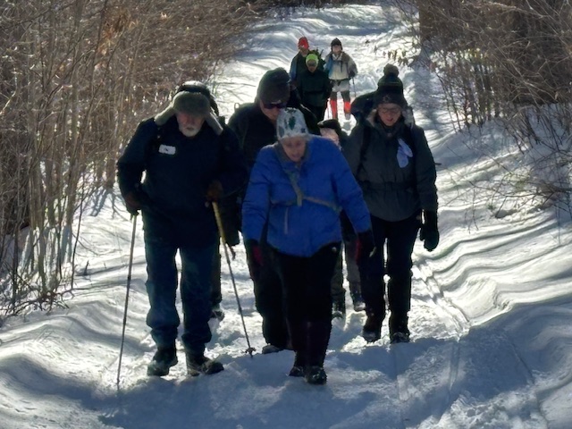 Apparently the slower group didn’t recognize the frozen brook as they crossed over it and went way past it before turning around. No harm. Dale stayed back and waited for the second group to arrive, then the slow gang departed up towards the trailhead even before the first group came back from their little forays. After a short break at the afore mentioned junction, the first group took a break enjoying Sheldon supplied raspberry pastries (similar to the ones he had brought up Pleasant Mountain last week). We all then headed back toward the trailhead, overtaking the second group on the way with the last hiker arriving back to our vehicles at 11:30 AM.