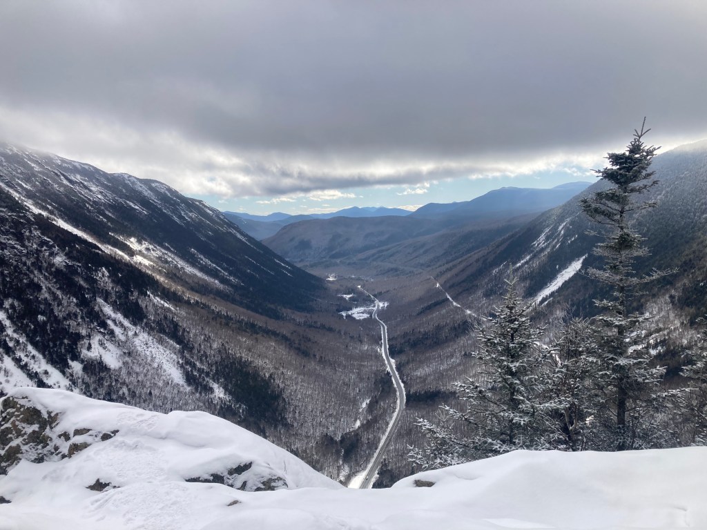 The notch stretches out far below you as a long half-cylinder bisected by Rt. 302 with the cliffs of Mt. Webster on the left side and the slopes of the Willey Range, crossed by the Conway Scenic Railroad, on the right side.