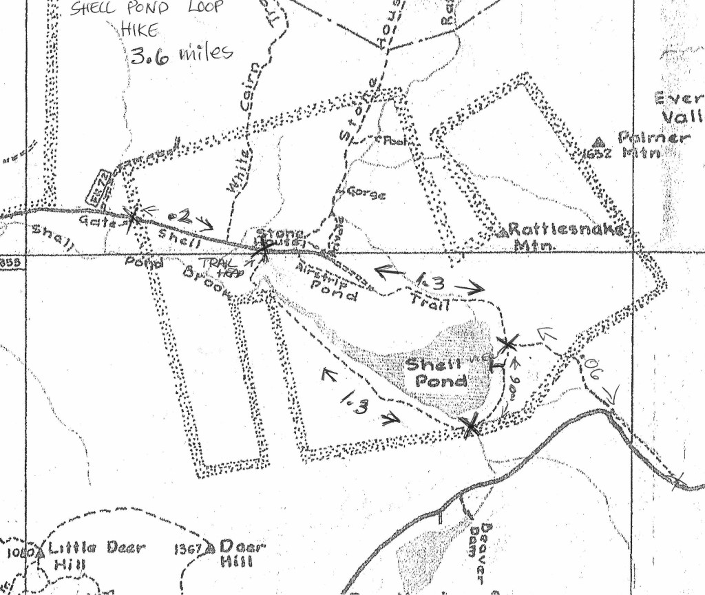 Pass through the gate and follow the road for .2 miles to the Shell Pond Loop Trailhead on your right. The trail passes through a meadow and along the river, to a bridge crossing the Shell Pond Brook, and then swings left on a well-worn woods road. It traverses the slope above the south shore of Shell Pond. At 1.3 miles the trail turns left off the road and descends, meandering through the woods behind the east shore of the pond, and crossing several small brooks. At 1.7 miles a spur leads to a clearing and a view of Baldface across the pond. The main trail then bears right and meets the Shell Pond Trail at 1.9 mile. The trail turns left, broadens and runs alongside the base of Rattlesnake and Albany Mountains. The trail crosses a bridge over the Rattlesnake Brook and continues along the brook and through an orchard. Eventually the trail opens to an airfield with a view of the Stone House on the right. At 3.4 miles the trail returns to the Shell Pond Loop Trailhead after passing two trails leading to Blueberry Mountain on the right. The gate is straight ahead.